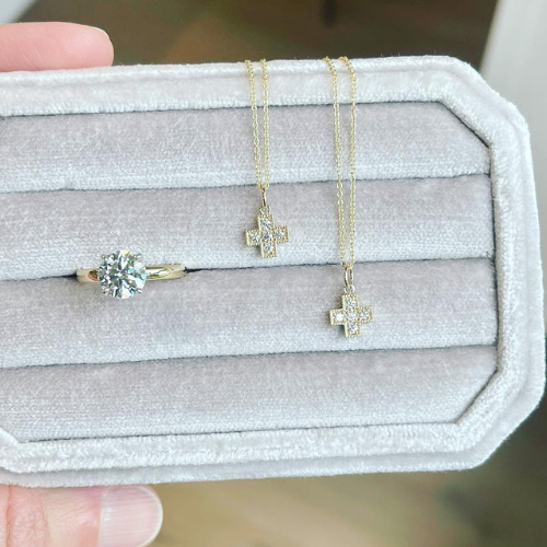 Ready for a change, our client reset her engagement ring into a classic solitaire with updated details. The side diamonds were repurposed into two crosses, symbolizing her love for her daughters.