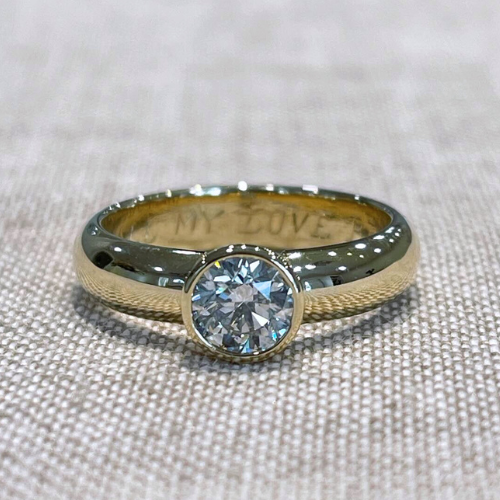 Combining her father’s wedding ring and her mother’s diamond, we created a simple, sentimental ring with clean, classic lines. The original hand engraving was carefully preserved, making this piece a touching tribute to both parents.