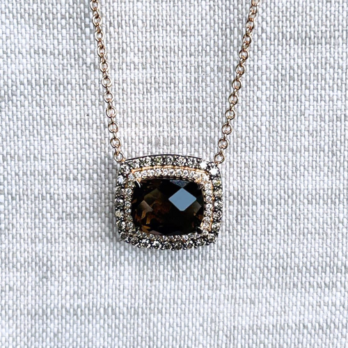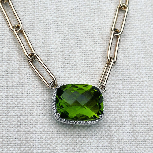 This vibrant peridot pendant was refreshed by rotating the design and attaching it to a chunky paperclip chain, creating a modern and bold statement piece.