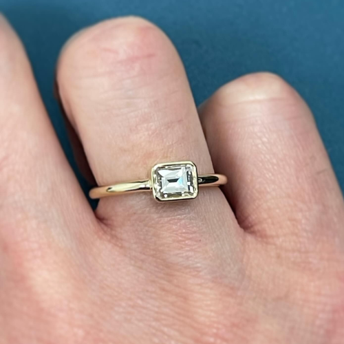 This transformation began with the center diamond from a ring inherited from our client’s aunt. Captivated by its unique sparkle since childhood, she chose to reset the step-cut diamond into an east-west yellow gold bezel ring, creating a timeless piece for her right hand while honoring her aunt’s memory.
