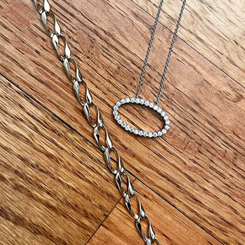 A gold bracelet and diamond pendant were united to create a single stunning piece. By placing the diamond oval at the center of the bracelet, we achieved a harmonious design that balances old and new.